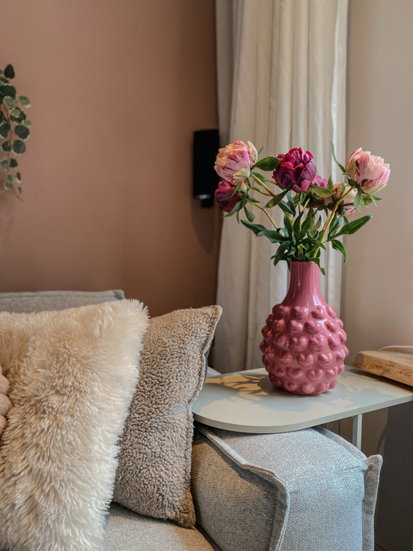 De Waanzinnige Kusjes Vaas is een echte eyecatcher met haar prachtige, diepe roze kleur. Deze vaas voegt direct warmte, lef en een vleugje romantiek toe aan je interieur. Door de elegante vorm en glanzende afwerking is ze zowel met als zonder bloemen een statement piece.