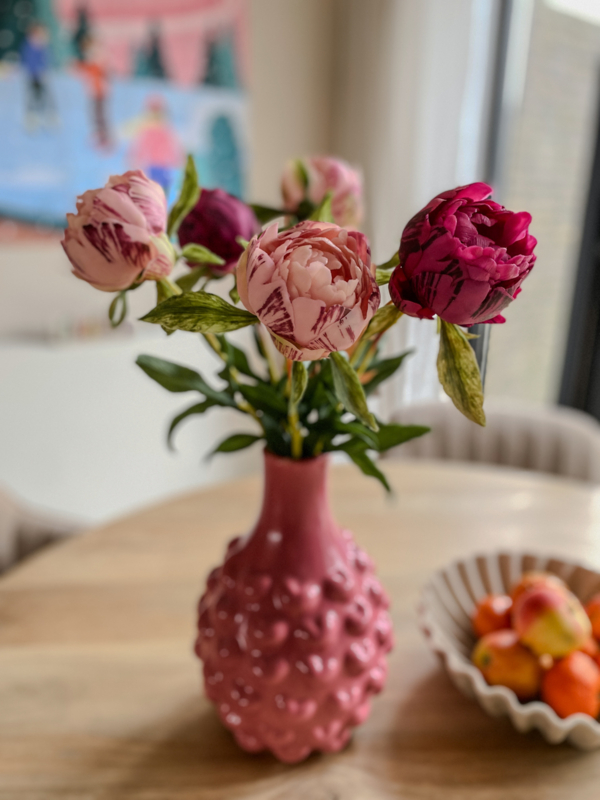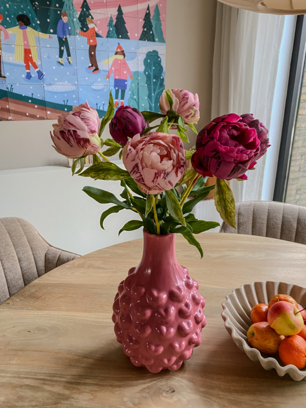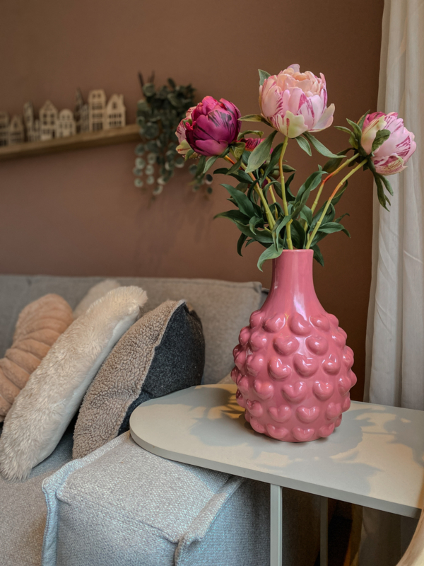 Met een afmeting van 18,5 x 18,5 x 27 cm is deze vaas perfect voor een vol boeket. In combinatie met de real touch pioenrozen van wax komt ze helemaal tot haar recht: de levensechte structuur en zachte uitstraling van de pioenrozen zorgen samen met de intense kleur van de vaas voor een waanzinnig mooi geheel.
