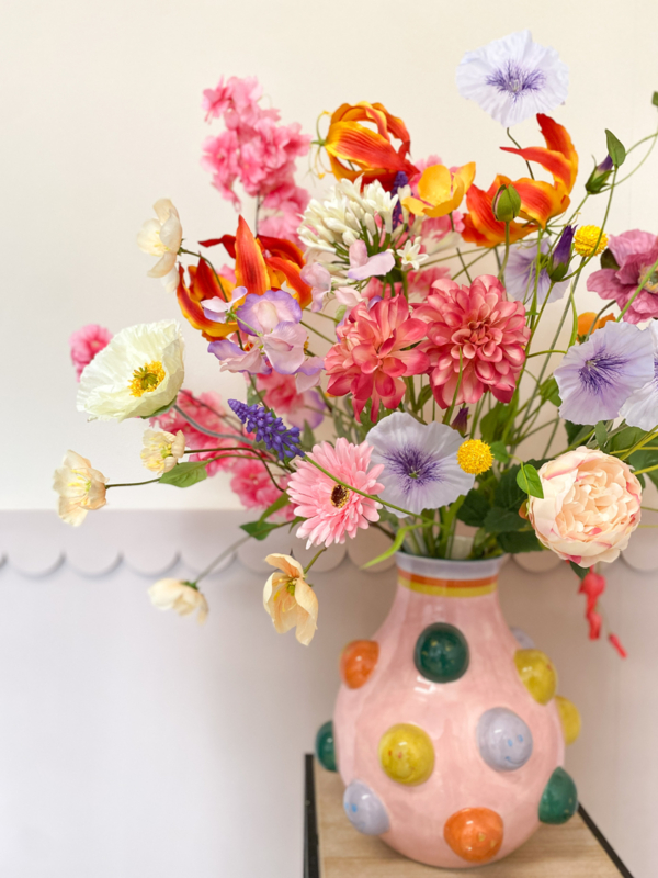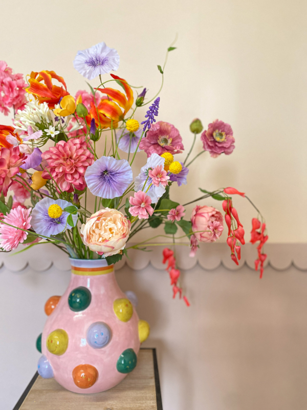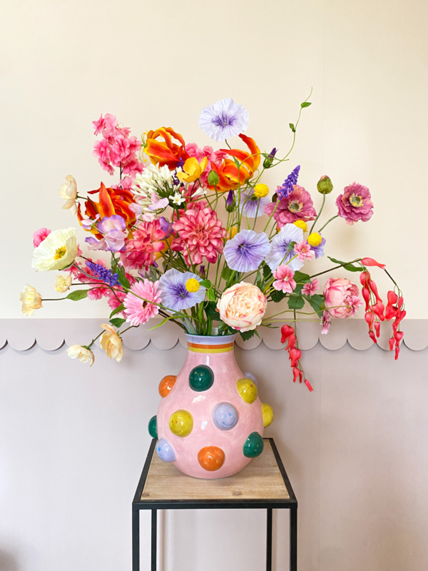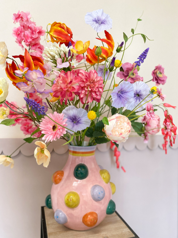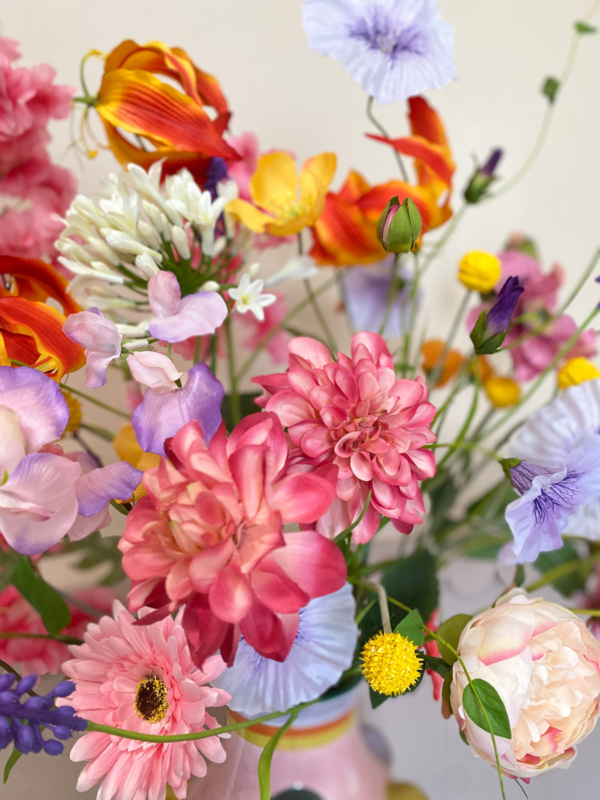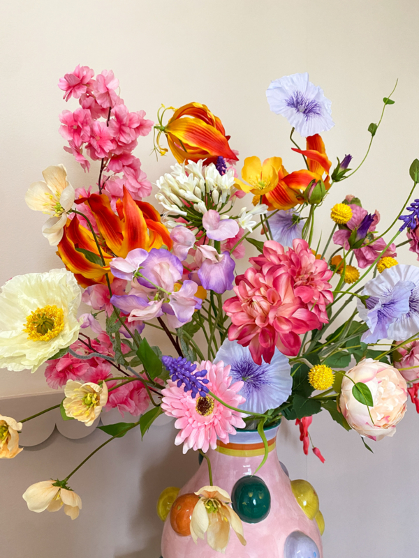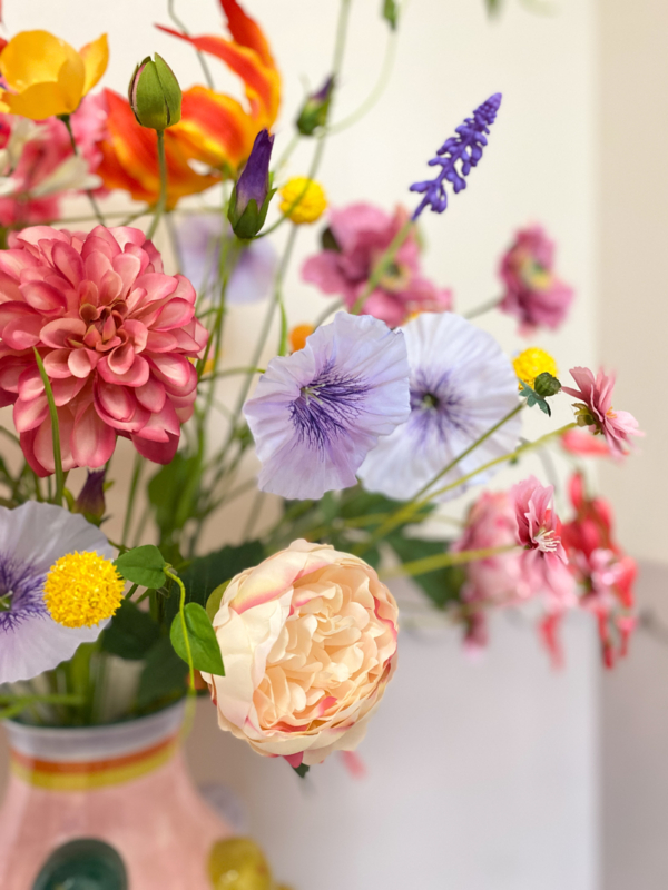Haal het voorjaar in huis met het prachtige zijden boeket Sunny. Dit vrolijke boeket combineert een rijke mix van kleuren zoals verschillende roze tinten, lila, geel, oranje, rood, perzik, en paars. Een echte eyecatcher die direct zorgt voor een frisse en levendige sfeer in elk interieur.