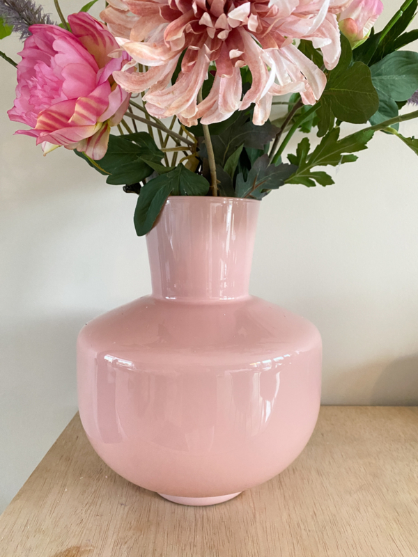 Vaas zacht roze | LDeze elegante glazen vaas in zacht roze is een verfijnde toevoeging aan ieder interieur. De subtiele kleur zorgt voor een warme, frisse uitstraling en laat bloemen – zowel zijden als verse – prachtig tot hun recht komen.